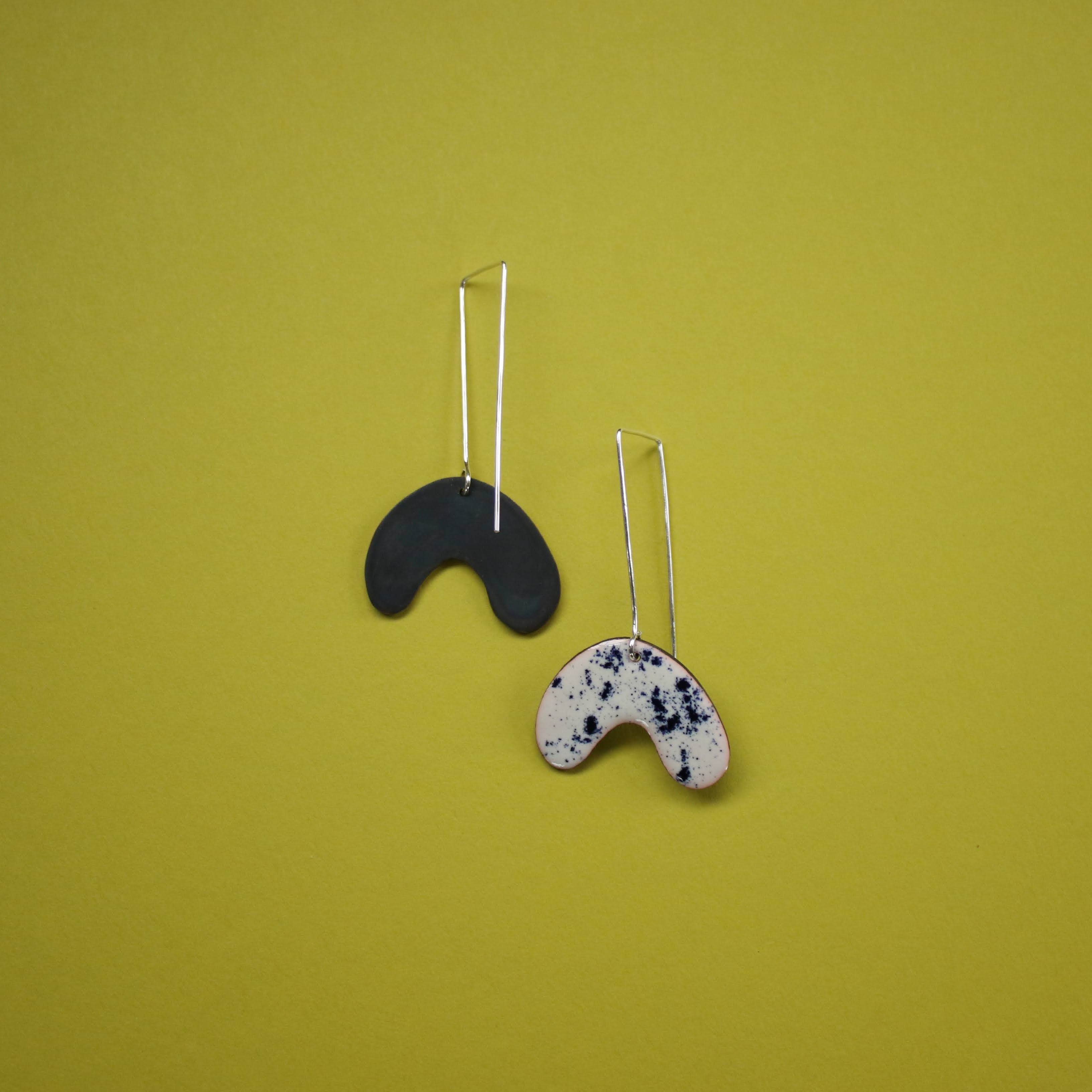 Black and white splatter pattern enamel statement earrings. Handmade with recycled sterling silver and copper. The copper has been oxidised to give a smart black finish on the back.