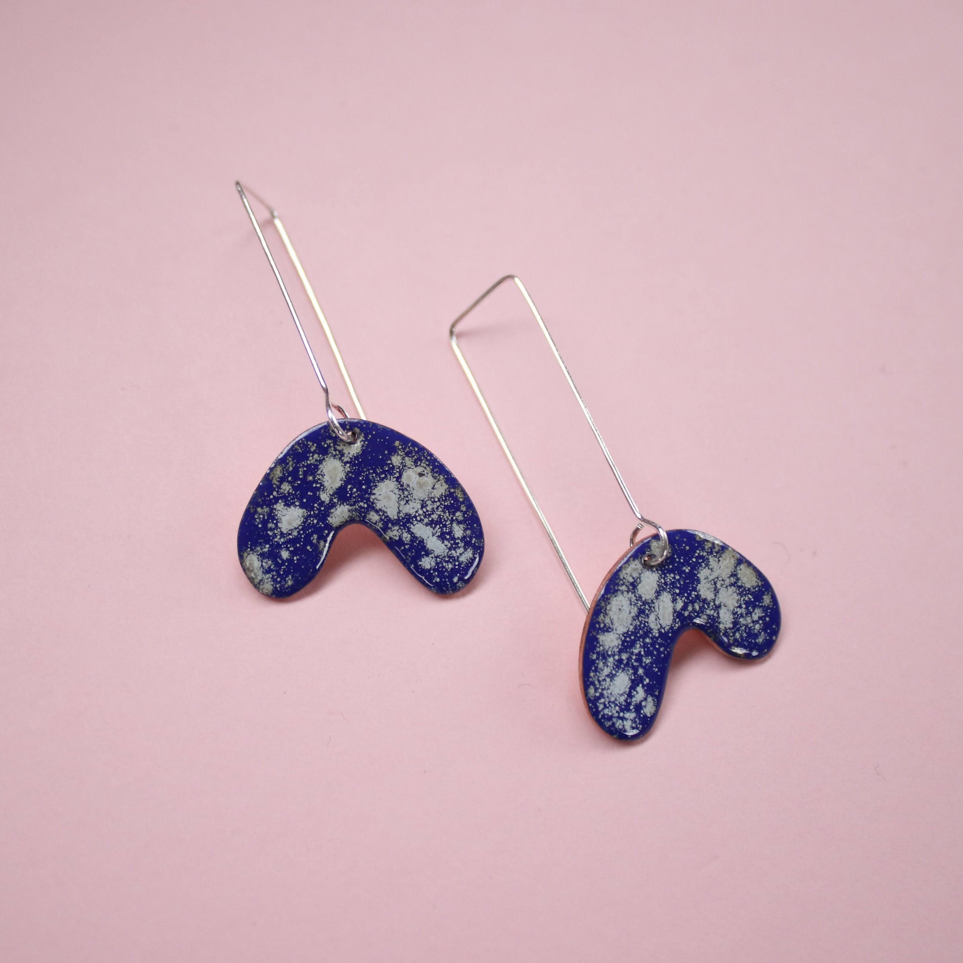 Blue and white enamel statement earrings. Finished with a modern square hook.