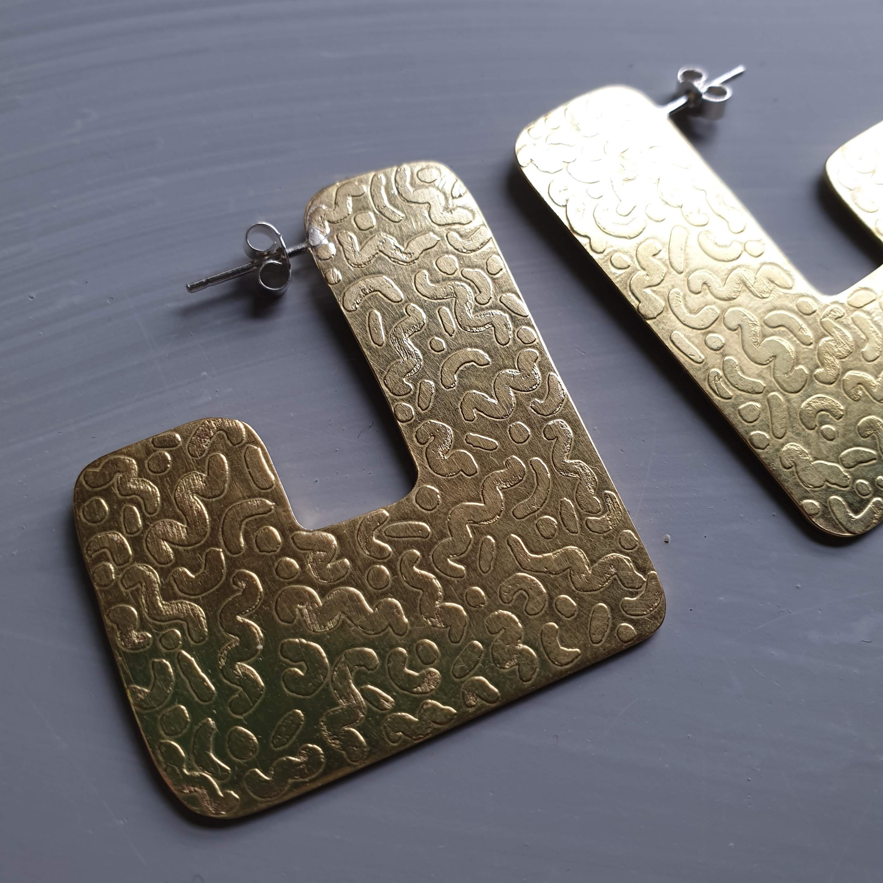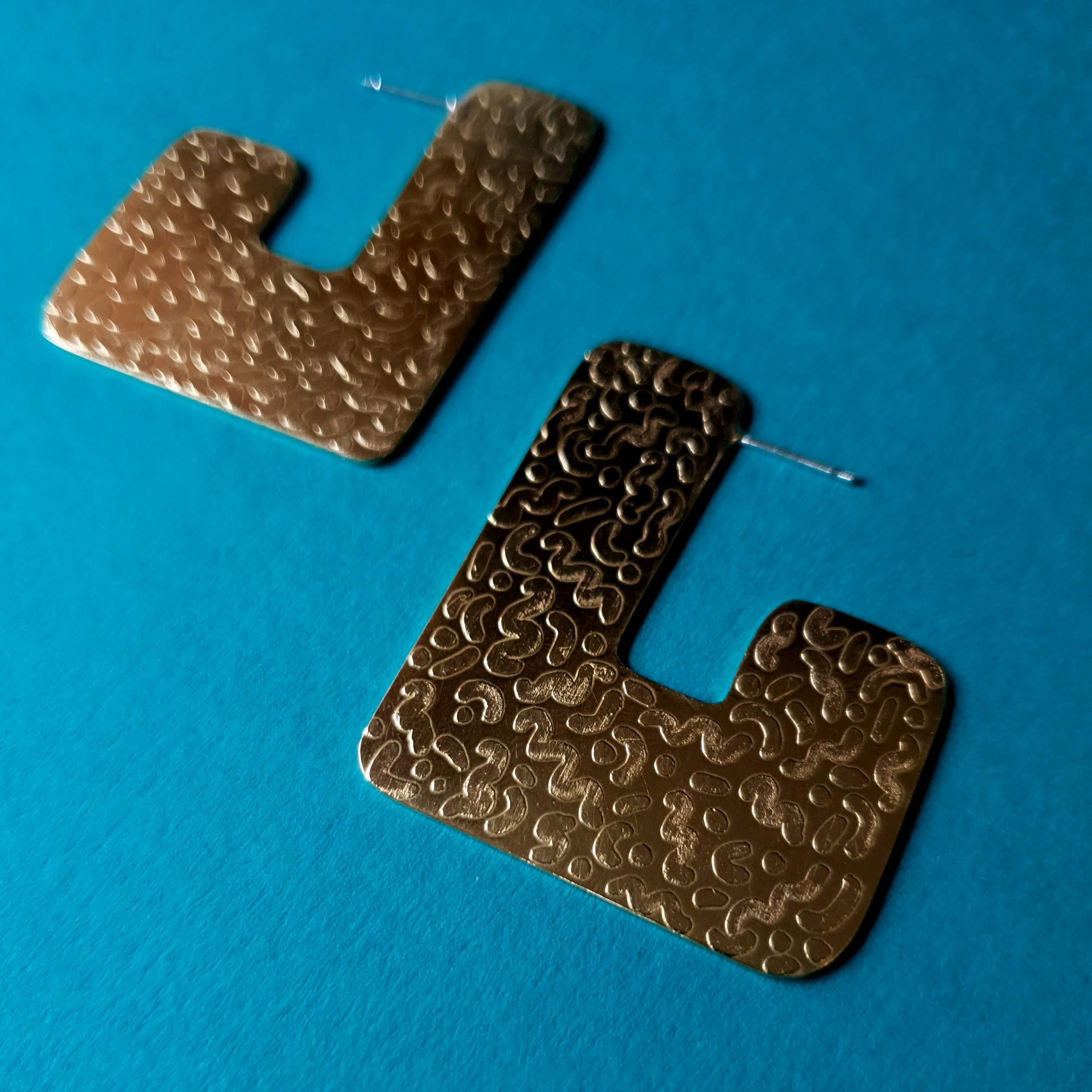 Handmade etched square brass hoops with sterling silver ear post and butterfly.