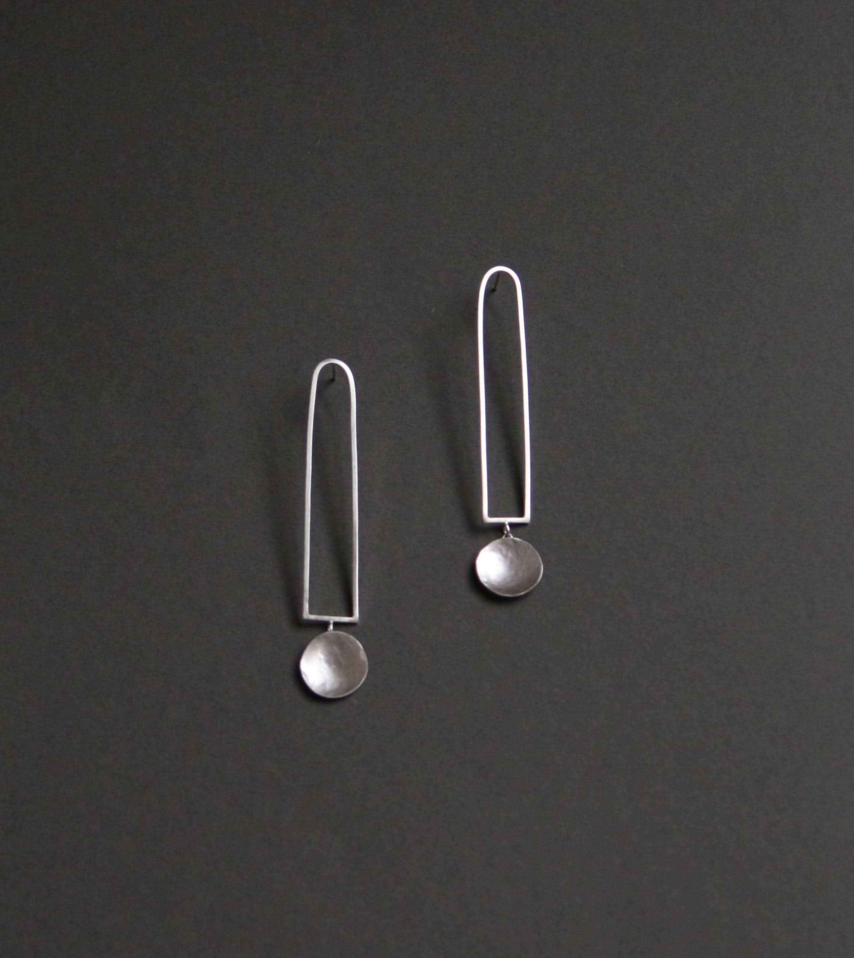Sterling silver geometric arch with a delicately textured circle. The pieces have been attatched in a way that allows the circle to move, so even though they are studs they still have an elegant, natural movement to them. The earrings have been given a bushed finish for a modern touch.