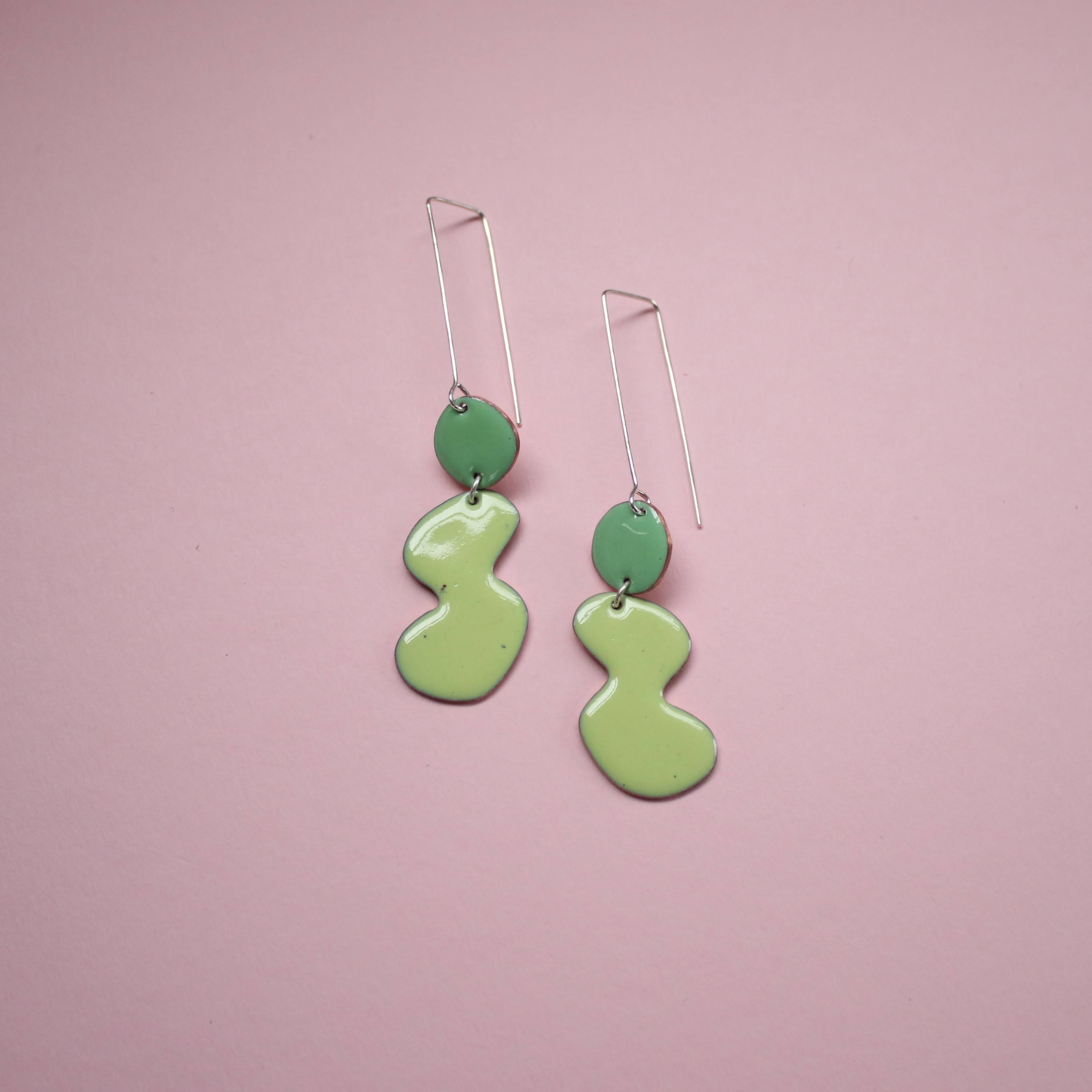 Green enamel squiggle statement earrings. Handmade with recycled sterling silver and copper.