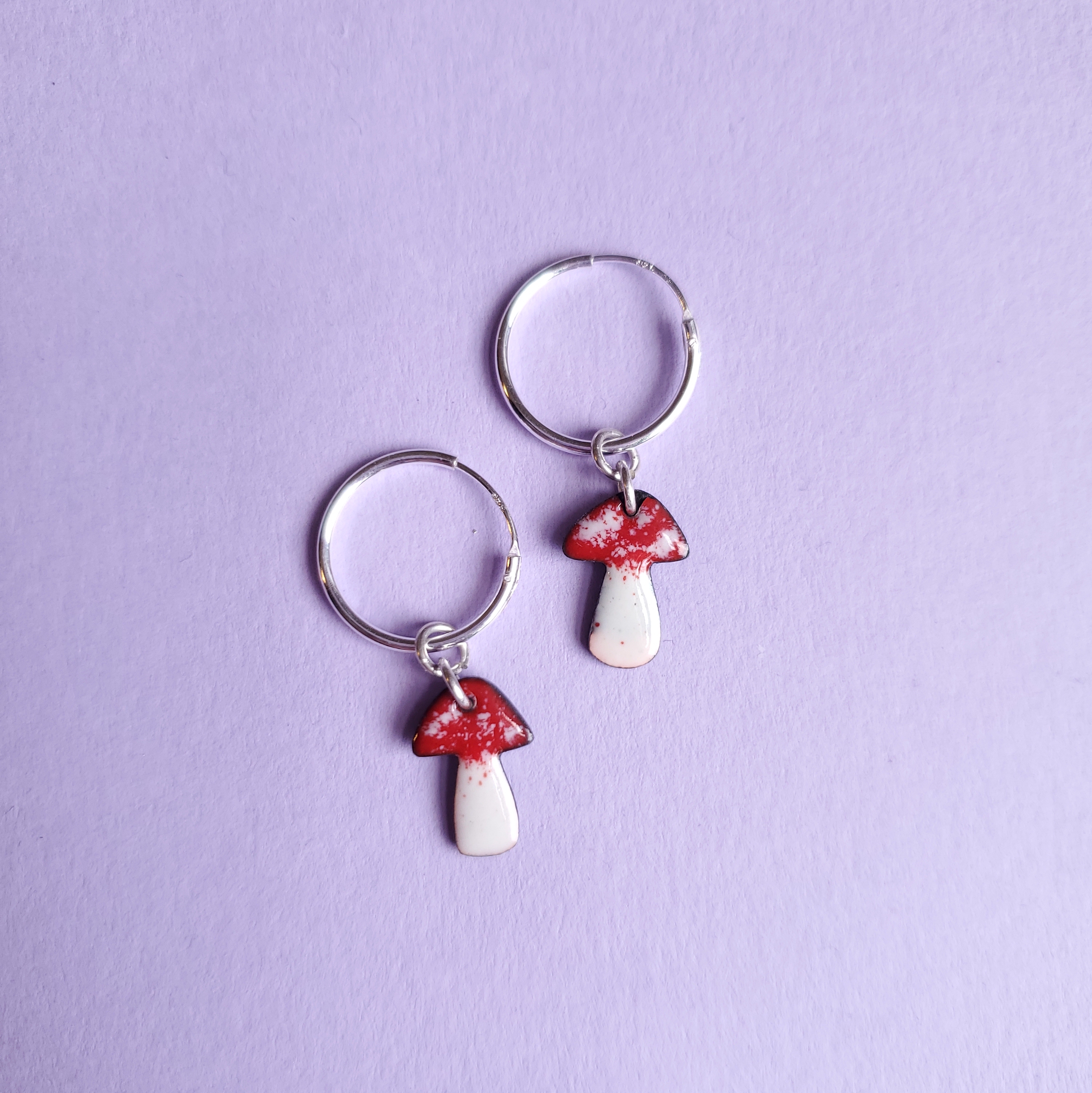 Sterling silver hoop earrings with an enamelled mushroom charm.
