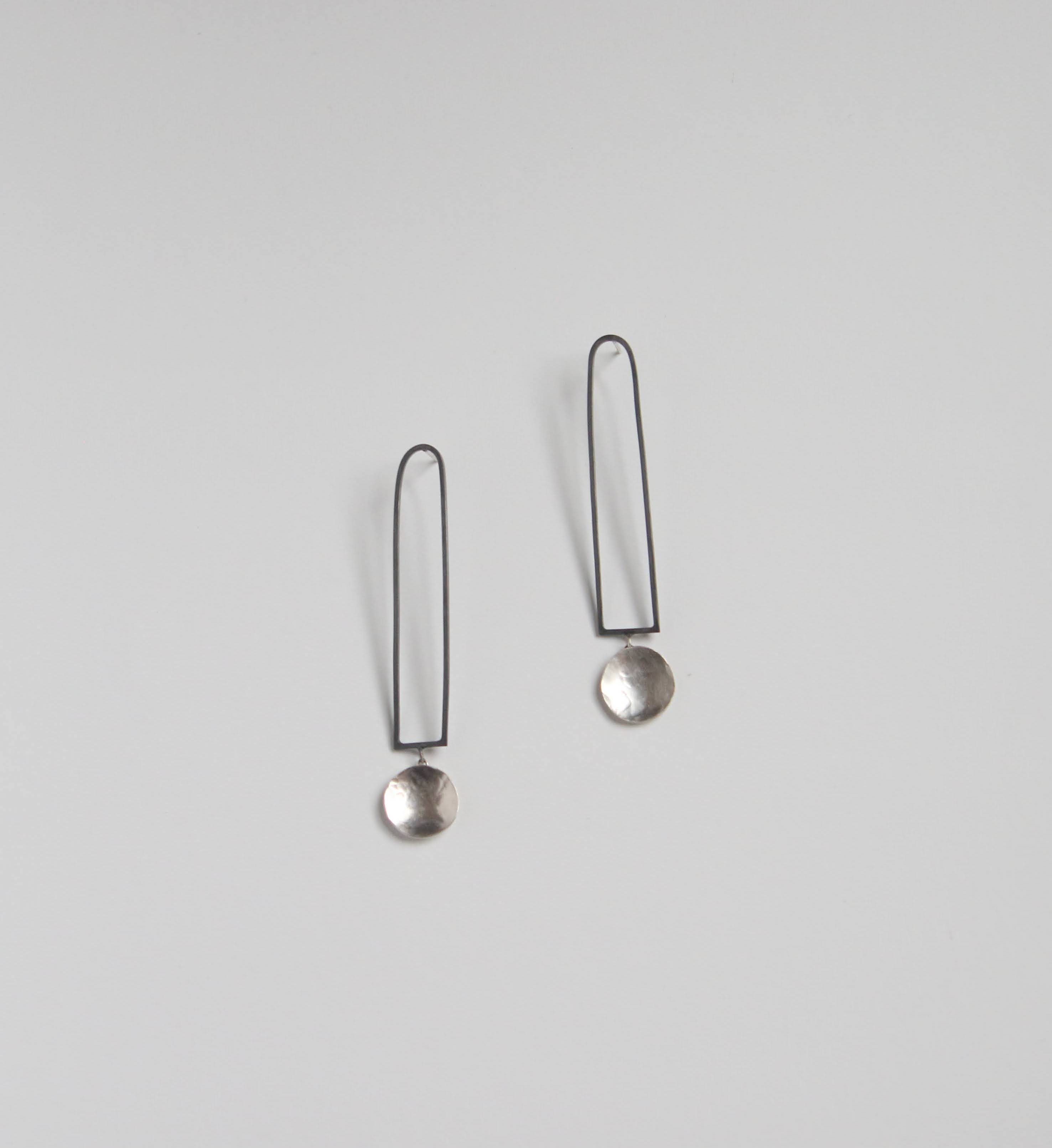 Sterling silver geometric arch with a delicately textured circle. The pieces have been attatched in a way that allows the circle to move, so even though they are studs they still have an elegant, natural movement to them. The top sections of the earrings have been oxidised to give a little drama and a modern touch.